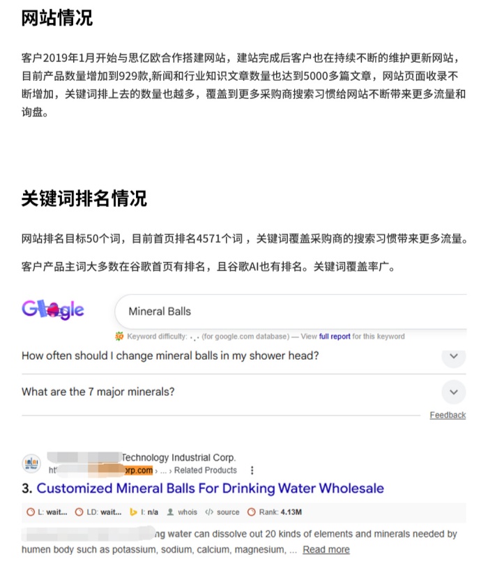 思亿欧深耕谷歌网站SEO搜索引擎优化领域,以专业技术为核心竞争力,为中国企业搭建高效海外获客通道,助力民族品牌拓展全球市场。本次合作的合作伙伴,自2005年创立以来,始终专注水过滤介质领域,组建了一支集研发、生产、销售与服务于一体的专业团队。凭借二十余载在高科技领域的技术深耕与经验沉淀,该企业不仅稳居中国净水过滤介质供应商前五行列,更能在业水处理、功能性饮用水、美容护理等多元场景,为全球客户提供全方位、定制化的用水解决方案,雄厚的产品实力与行业口碑,为双方谷歌推广合作奠定了坚实基础。2019年1月,思亿欧与该企业正式达成合作,以谷歌SEO优化为核心抓手,精准布局海外市场,开启高效获客新征程。